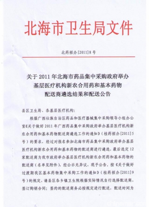 2011年广西北海市关于药品集中采购政府举办基层医疗机构新农合用药和基本药物配送商遴选结果和配送公告