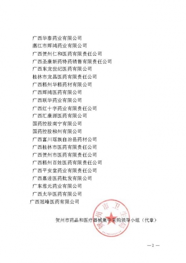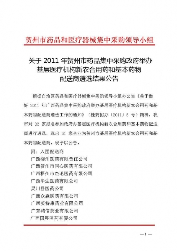 2011年广西贺州市关于药品集中采购政府举办基层医疗机构新农合用药和基本药物配送商遴选结果公告