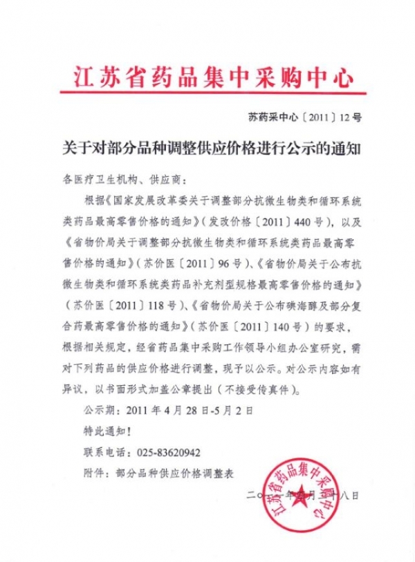 2011年江苏省关于对部分品种调整供应价格进行公示的通知(2011-04-28)