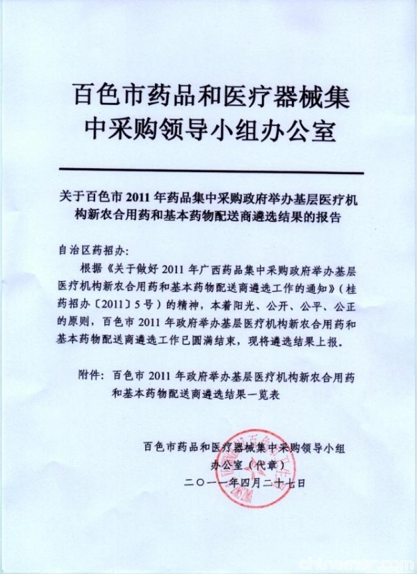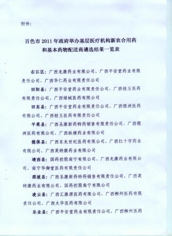 2011年广西百色市关于药品集中采购政府举办基层医疗机构新农合用药和基本药物配送商遴选结果的报告