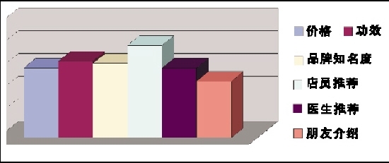 在顾客购买的决定因素调查中,决定因素主要是店员推荐,其次是功效、品牌知名度、价格、医生推荐和朋友推荐。