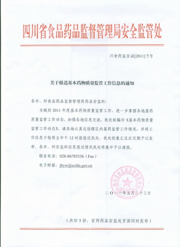 2011年四川省关于报送基本药物质量监管工作信息的通知