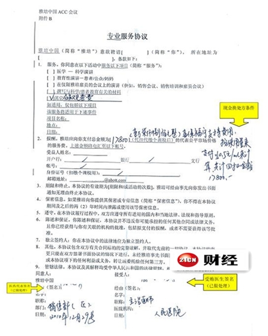 在“你同意在以下活动中提供以下项目”一项中,在选项中的第五项“其他”一栏,填着“临床观察费”(手写)。在其中一张协议书里记者看到,“雅培应向你支付总金额为17800元(金额是手写上去的)。”旁边还有一排小字:“喜保福宁支持费用,按使用量来支付0.5元/毫升计算,共计回扣金额17800元。”雅培公司的签名和接受人的签名都被抹去了,日期是2010年12月29日。另外两张协议书的内容大致相同,只是金额上略有出入。