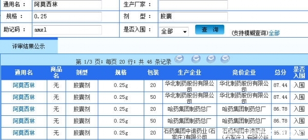 企业可通过相关条件查询药品,页面中会显示药品的技术标得分及入围情况。得分一栏为“/”的为竞价企业小于等于2个的药品,不参加技术标直接进入商务标。