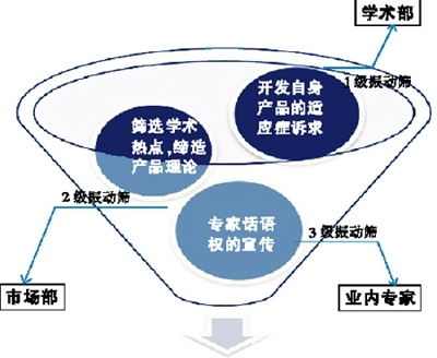 如图所示,该模型的成功运用需要企业扩大“漏斗”的第一层平台,开发产品在临床上的功效和诉求,继而把握市场的需求和动态,结合领域热点,在漏斗向下延伸的每一个环节中,精准地层层过滤。