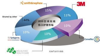 根据MEDMARKT DILIGENCE LLC对2008年全球高端医用敷料的研究报告,其中以NPWT(负压引流治疗)、HBO(高压氧治疗)和PASSIVE COMPRESSION为代表的3类治疗方法占14亿美元的市场份额,泡棉敷料11亿美元,水胶体敷料9亿美元,藻酸盐及水化纤维敷料4亿美元。预计在2008~2017年间,生长因子治疗方法会迎来高度增长,将从2008年的2亿美元增长到2017年的10亿美元,增长率达400%。