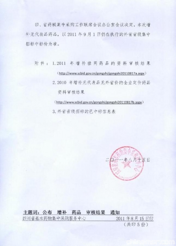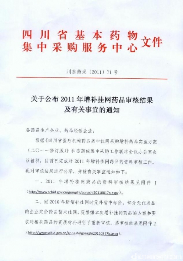 2011年四川省关于公布增补挂网药品审核结果及有关事宜的通知