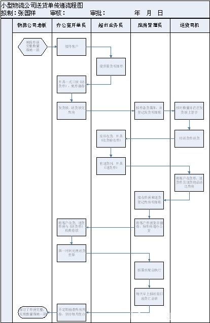 谢谢张老师,我确实是一个凭感觉做事的人,原则性不好。公司有3量送货车,厂家来货库房收货,然后把单子交办公室;办公室开出库票给超市,库房备货人员凭备货联备货装车,然后送往超市,回单,回单会有超市没收的,也会有残损,超市会有退货。