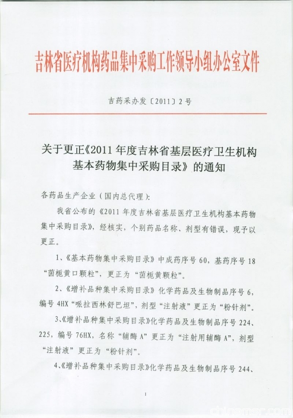 关于更正《2011年度吉林省基层医疗卫生机构基本药物集中采购目录》的通知(吉药采办发[2011]2号)