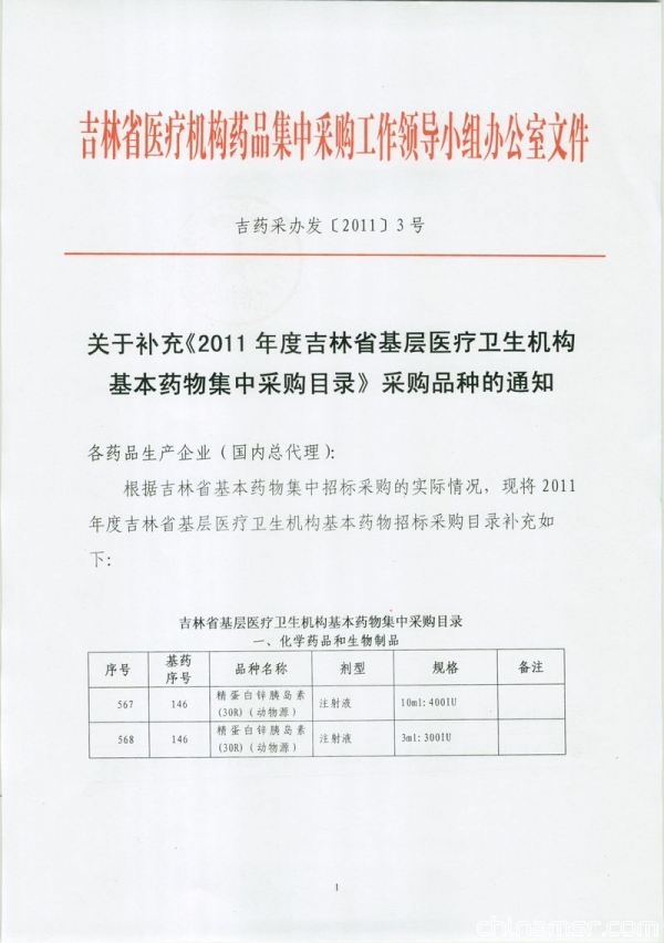 2011年吉林省关于补充《2011年度吉林省基层医疗卫生机构基本药物集中采购目录》采购品种的通知