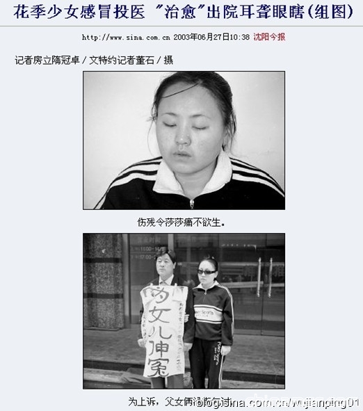 几年前的圣诞夜,16岁的莎莎(化名)突然发烧、感冒,经过本溪市中心医院一番治疗,花季少女竟落下了左耳失聪、左眼失明的伤残。愤怒的父母拿起了法律武器,一审法院却驳回了诉状。为了上诉,父女俩来沈沿街乞讨。莎莎的遭遇得到了热心人的关注,著名律师金锡盛得知情况后当即决定为其免费代理诉讼。辽宁省高级人民法院免去其诉讼费1.4万元,黑暗中的少女终于感受到了一丝光明。