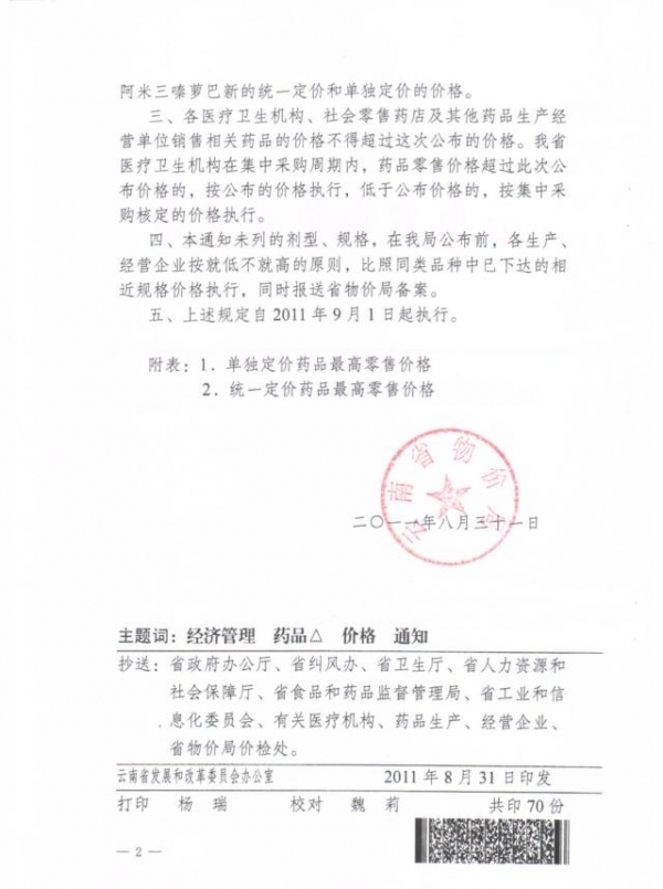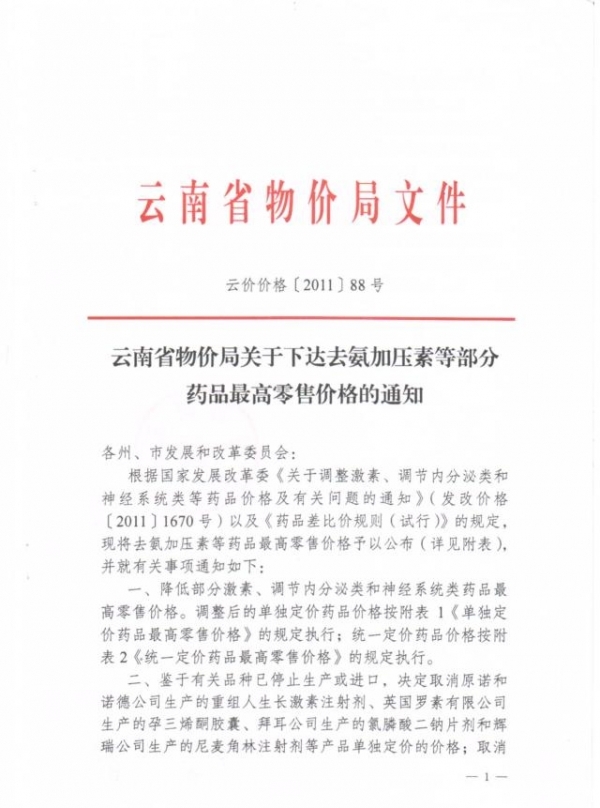 2011年云南省物价局关于下达去氨加压素等部分药品最高零售价格的通知