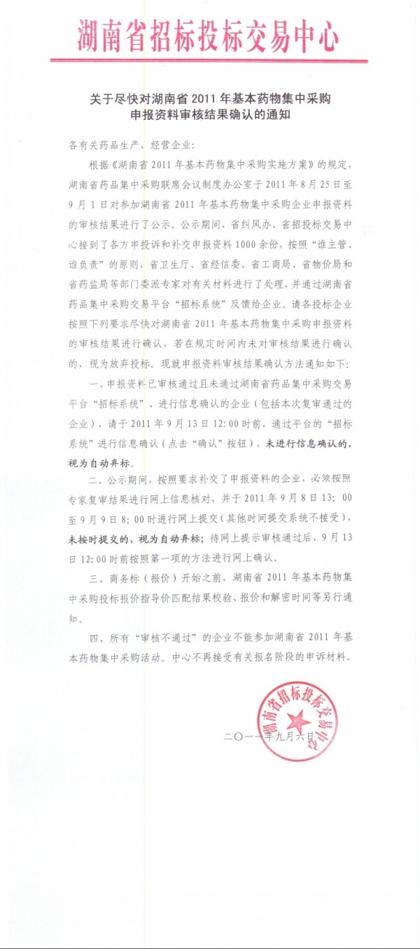 2011年湖南省关于尽快对基本药物集中采购申报资料审核结果确认的通知