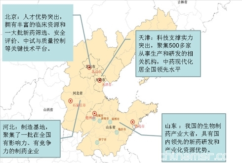 北京市是环渤海地区生物医药的研发中心,初步形成以生命所、芯片中心和蛋白质组中心为主体的研发创新体系;天津市以出口为导向,是环渤海地区重要的现代生物医药产业制造基地和关键技术的研发转化基地;山东省、河北省是环渤海地区生物医药制造业的重要省份,均具有良好的传统医药产业基础。其中,山东省行业产值、利税多年来位居全国前列。