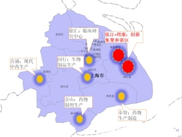 "一个核心,五大基地":形成了浦东张江-周康、闵行和徐汇为中心的生物医药研发、临床服务外包和产业基地,以奉贤、金山、青浦为重点的生物医药药物制造基地。