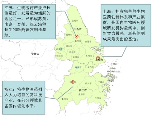 上海市跨国生物医药企业研发中心密集,融资环境良好,集聚了世界生物医药前十强中大部分企业,已经形成了以中科院药物所、国家基因组南方中心为主的"一所六中心"体系,是长三角地区乃至我国生物医药的技术研发与成果转化中心。江苏省是我国生物医药制造业领域的领军者,2010年产值超过2000亿,位居全国第一。