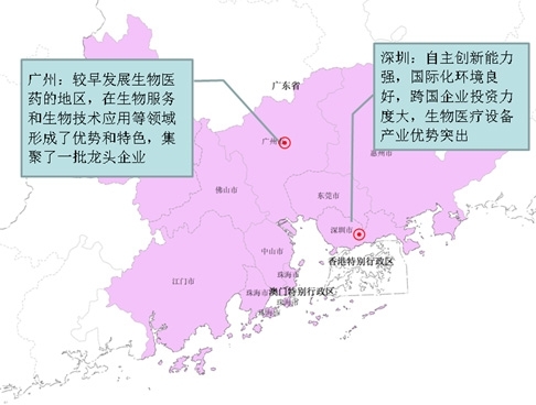 深圳生物医疗设备、生物制药企业规模全国领先,以创新药物研发和产业化、药品制剂出口和生物医药研发外包为核心的产业体系发展较快。随着生物医药产业被列为深圳市"十二五"重点发展的三大新兴产业之一,以及国家级基因库的建设,深圳作为我国南方生物医药产业核心城市的地位将进一步巩固。广州生物医药产业集群目前已形成了"两中心多区域"的产业布局,聚集了150多家生物企业和一批国家级生物科研机构,形成了从生物技术研究、中试到产业化的完整产业链条。?