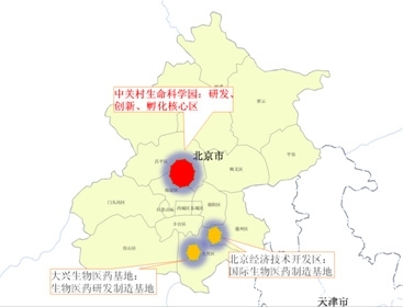 "一心两基地":北京国家生物产业基地由中关村生命科学园、北京经济技术开发区和中关村大兴生物医药基地三个核心区构成。中关村生命科学园主要承担创新功能,北京经济技术开发区与大兴生物医药产业基地共同承担制造功能。