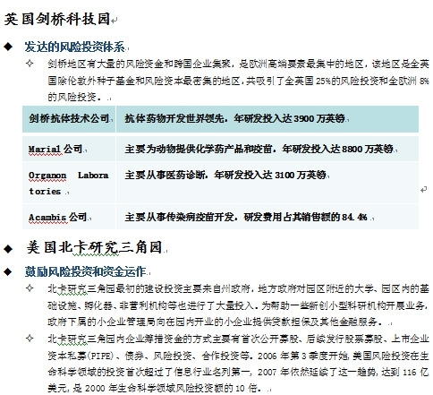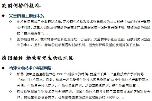 欧洲生物医药科技园在创新体系建设比较完善。一方面,国家政策的支持和资金扶持,保障了创新活动的开展;另一方面,相关机构的积极参与和相关产业的相互促进带动了整个生物技术领域的发展。
