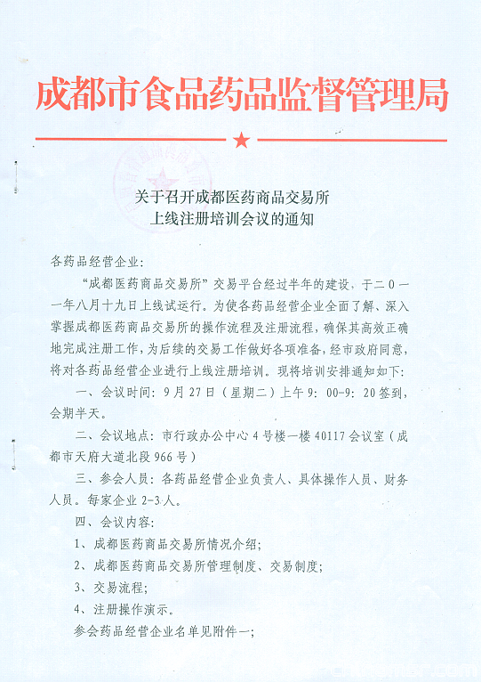 根据市政府统一安排,市食品药品监督管理局拟召开会议,对药品经营企业进入成都医药商品交易所交易平台进行注册培训,现将相关事宜通知如下: