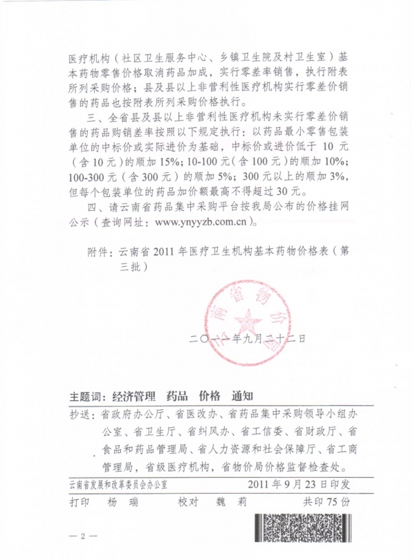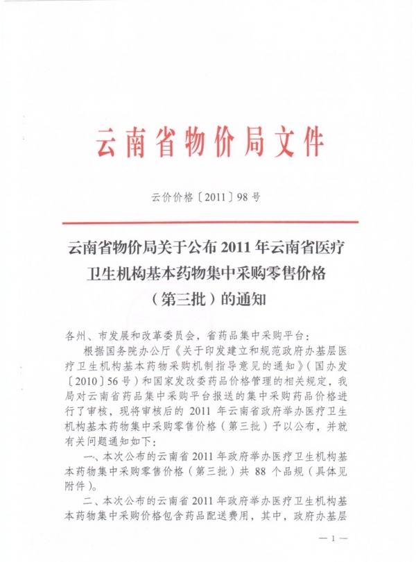 云南省物价局关于公布2011年云南省医疗卫生机构基本药物集中采购零售价格(第三批)的通知(20110927)