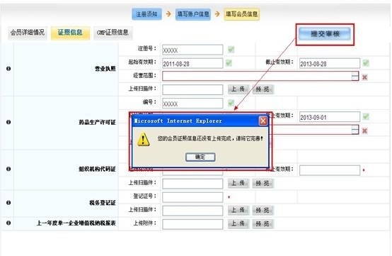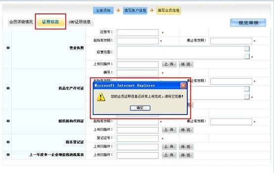 7、若证照信息填写或上传不完整,点击“提交审核”按钮时,系统会提示“您的会员证照信息还没有上传完成,请将它完善!”(如下图)。