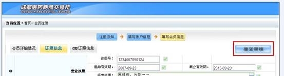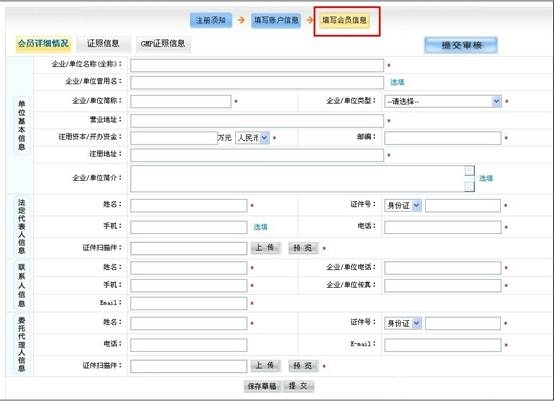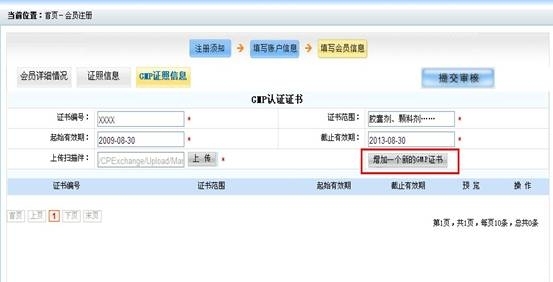 11、所有GMP证书填写及上传完成后,点击“提交审核”按钮,系统弹出已提交审核提示框(如图十三),点击提示框上的“确定”按钮,系统提示注册成功(如图十四)。注册成功后,请牢记用户帐号及会员编号。