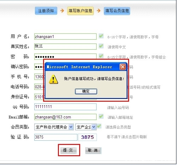 (3)所有信息填写完成后,点击“提交”按钮,弹出“帐户信息填写成功,请填写会员信息!”对话框(图七)。点击“确定”按钮,进入“填写会员信息”页面(图八)。