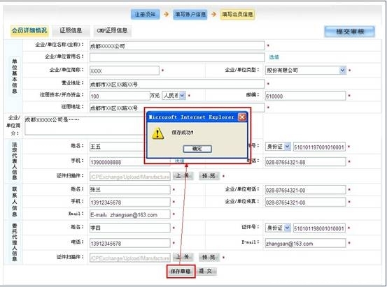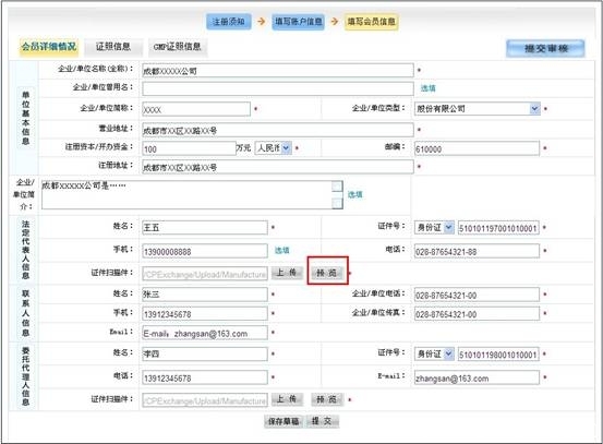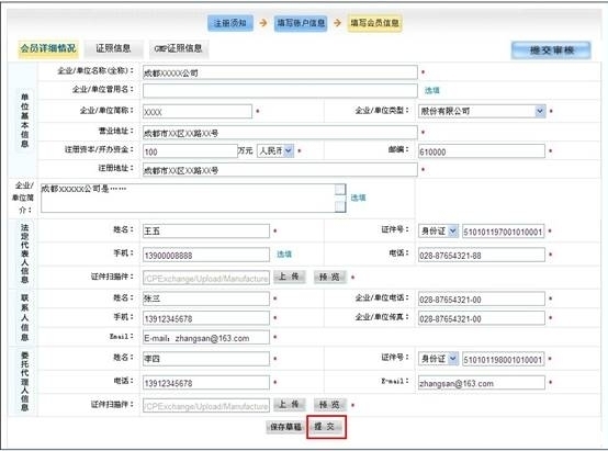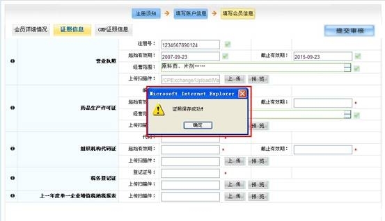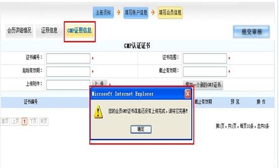 (3)所有信息填写完成并上传证件扫描件后,点击“提交”按钮(如图十一),系统直接转入“证照信息”的页面,并弹出“您的会员证照信息还没有上传完成,请将它完善!”提示框(如图十二)。