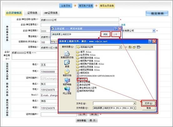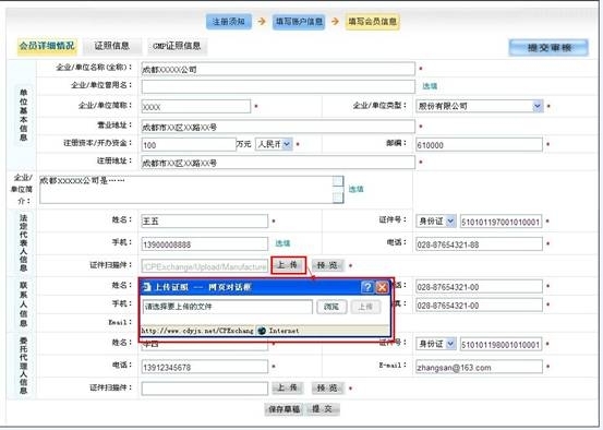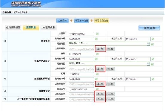 5、依次录入各个证照的基本信息,并点击“上传”按钮完成证照扫描件或附件的上传。上传证照的步骤及方法与填写“会员详细情况”时上传“证件扫描件”的步骤及方法相同。