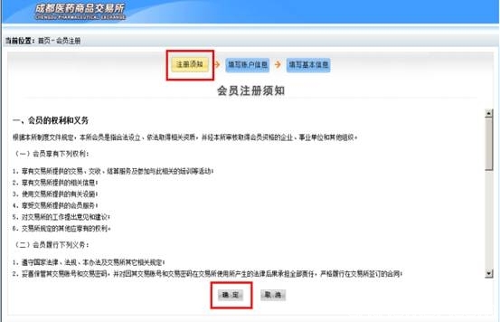 2、为了更好的了解会员的权利和义务,请认真阅读“会员注册须知”,点击“确定”按钮(如下图),进入注册页面。
