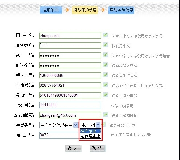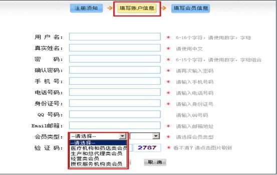 3、首先进入“填写帐户信息”页面。按要求填写相关信息。其中“会员类型”在下拉框中进行两步选择。