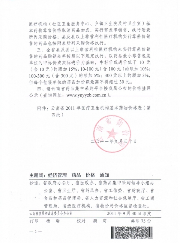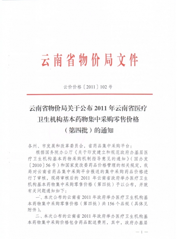云南省物价局关于公布2011年云南省医疗卫生机构基本药物集中采购零售价格(第四批)的通知