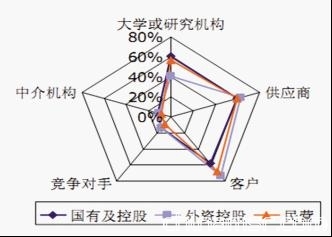 数据显示,58%的国有及控股企业在产品创新过程中与客户进行了合作;在外资控股企业,这一数据是73%,民营企业为68%。另一方面,国有及控股企业在与大学或研究机构上的合作比例是最高的(61%),民营企业的数据和前者无显著差别,外资及控股企业的比例为41%。因此,大学和研究机构虽然能为医药企业在技术上提供帮助,但企业还是创新主体,能更加敏锐地贴近市场需求。