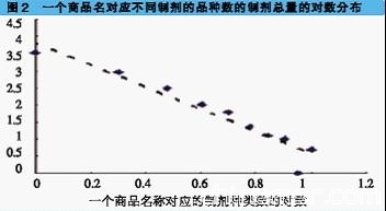 同一个商品名对应不同剂型规格制剂的品种数、相应的制剂总量分别取对数,呈直线(参见图2),符合Zipf幂律分布。