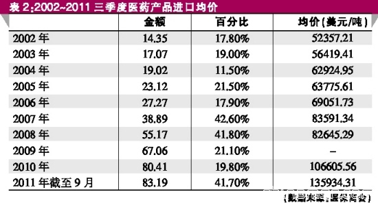 伴随着国内经济规模的快速增长,中国医药产业规模也由2001年的区区2767亿元,预计增长到2011年的超过1.3万亿元。以医保商会的数据按照同比汇率(为了比较方便,汇率统一换算为1:6.5),我国医药产品进出口总额由2001年的600亿元增长到近4000亿元,增速明显快于中国在全球贸易整体规模增长。