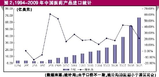 出口方面,可以看到明显的阶段加速:1994~2000年,医药品出口规模从11.85亿美元增长到17.88亿美元,年均复合增长率仅为7.1%;而2001~2009年则从19.78亿美元大幅增长到86.35亿美元,年复合增长率达到了27.83%。医药品进口增速过去十余年则基本保持接近20%的增长,与我国的整体贸易变化基本一致。