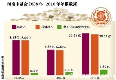 在公益支出方面,河南宋基会却“名落孙山”,找不见踪影,据河南宋基会披露的年报,其2008年至2010年的公益支出分别为0.5亿元、0.78亿元和1.39亿元。