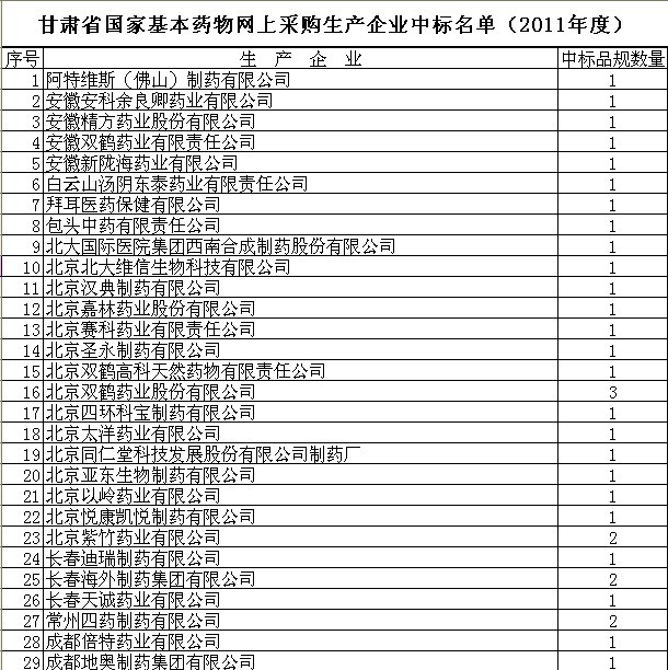2011年甘肃省国家基本药物网上采购可向酒泉范围内配送的中标配送企业名单