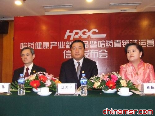 2009年12月1日,哈药直销试运营新闻发布会在哈尔滨万达假日酒店拉开序幕,虽说这场新闻发布会略显简单但绝不缺乏庄严。哈药直销领导班子亮相:直销副总裁赵伟(左一)直销总经理刘宏宇(中)直销副总裁蒋顺莲(右一)