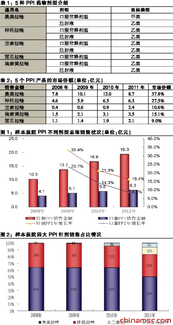 目前,在国内上市的PPI产品主要有:奥美拉唑、泮托拉唑、兰索拉唑、埃索美拉唑和雷贝拉唑。由22个重点城市样本医院的数据看到,仅该22个重点城市样本医院的PPI销售总额在2010年已达到22.5亿元,预计2010年总体PPI市场规模在200亿元人民币。以上5种PPI药物及主要剂型均已收载于2009年《国家基本医疗保险、工伤保险和生育保险药物目录》:其中奥美拉唑口服制剂目前为医保甲类产品,其他各产品均为医保乙类。而兰索拉唑注射液和埃索美拉唑注射液为2009年新进医保的PPI产品,因新进医保,2010年市场迅速增长。(见表1)