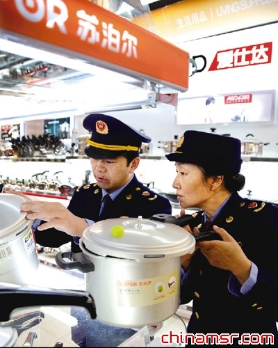 2011年10月19日,江苏连云港工商局执法人员在一家大型超市检查“苏泊尔”不合格商品。