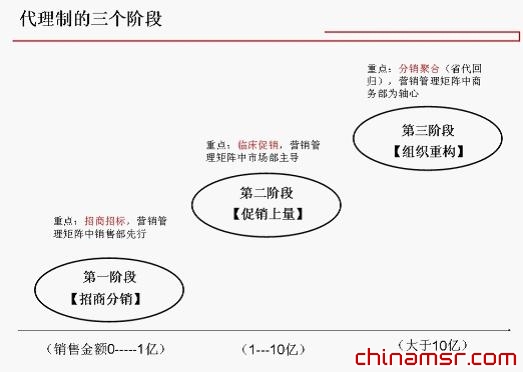 对企业内部而言的代理分为了三个阶段:第一个阶段,招商分销阶段。招商分销阶段是企业没有资源,在代理制初期的时候就是透支政策,把市场和代理商结合,这个时候的最重要任务就是找到更多代理商、开发更多医院,在这个过程中以销售部门为主。