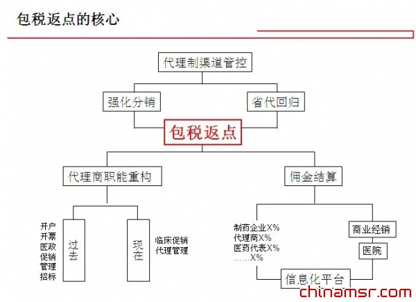 我出的招就是“包税返点”。怎么叫包税?就是企业既然高开,全部把税拿过来,当时还不成熟,为什么?“两票制”没有推之前,企业要把领导权力全部回收是有压力的,这个时候时机不成熟,除非是因为上市。但是今年的《药品流通环节价格管理暂行办法》促使市场行为理性回归,企业掌握领导的角色转换。只有企业把票开给医药公司,医药公司能够把钱全部到公司帐下,这种情况下才可能包税。包完税以后结帐模式就变了,过去我是卖给他货了,怎么销售是他的问题,现在变成他的流向我非常清楚,而且将来结算是他找我结算,我们俩再也不是买卖关系了。