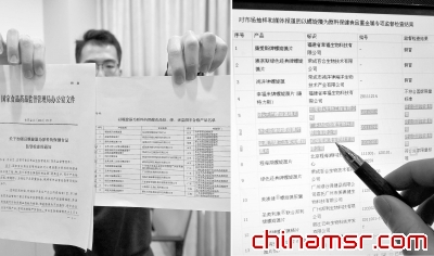 图为国家食品药品监督管理局办公室2月29日下发“关于加强以螺旋藻为原料的保健食品监督检查的通知”,“通知”中附有以螺旋藻为原料的保健食品铅、砷、汞监测不合格产品名单,其中汤臣倍健、绿A、金奥力牌三达紫光螺旋藻等产品赫然在列;然而国家食品药品监督管理局3月30日在其网站上发布的以螺旋藻为原料保健食品重金属专项监督检查结果却又显示以上几个产品符合国家标准(3月30日摄,拼版照片)。
