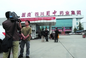 | 记者在被曝采用工业明胶胶囊的四川“蜀中制药”药厂大门外做现场报道。守在门口的工作人员告知领导外出不在,将记者挡在门外。 |