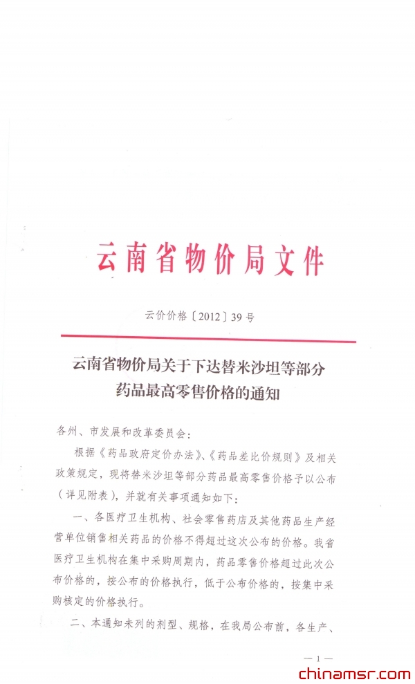 2012年云南省物价局关于下达替米沙坦等部分药品最高零售价格的通知