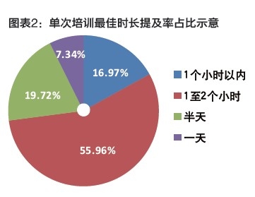 对于一线从业者而言,单次培训的时长控制在什么程度是最佳的呢?从反馈结果看,“1至2个小时”依然最受青睐,选择占比达55.96%。(参看图表2)