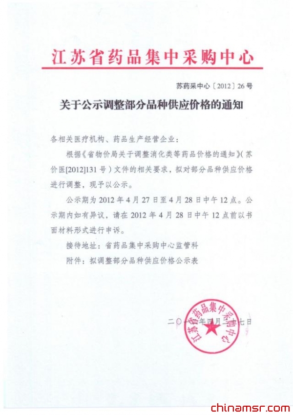 2012年江苏省关于公示调整部分品种供应价格的通知(附件已更新)