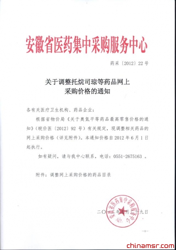 2012年安徽省关于调整托烷司琼等药品网上采购价格的通知